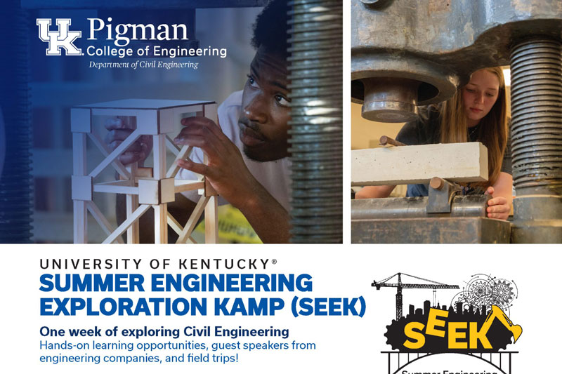 The University of Kentucky Department of Civil Engineering is hosting three one-week residential Kentucky camps (i.e., kamps!) for rising high school seniors. The Summer Engineering Exploration Camp (SEEK) will feature hands-on learning opportunities, guest speakers from engineering companies, and field trips to active project sites. Students will stay in dorms on UK’s campus along with civil engineering college students who will serve as mentors for the campers.